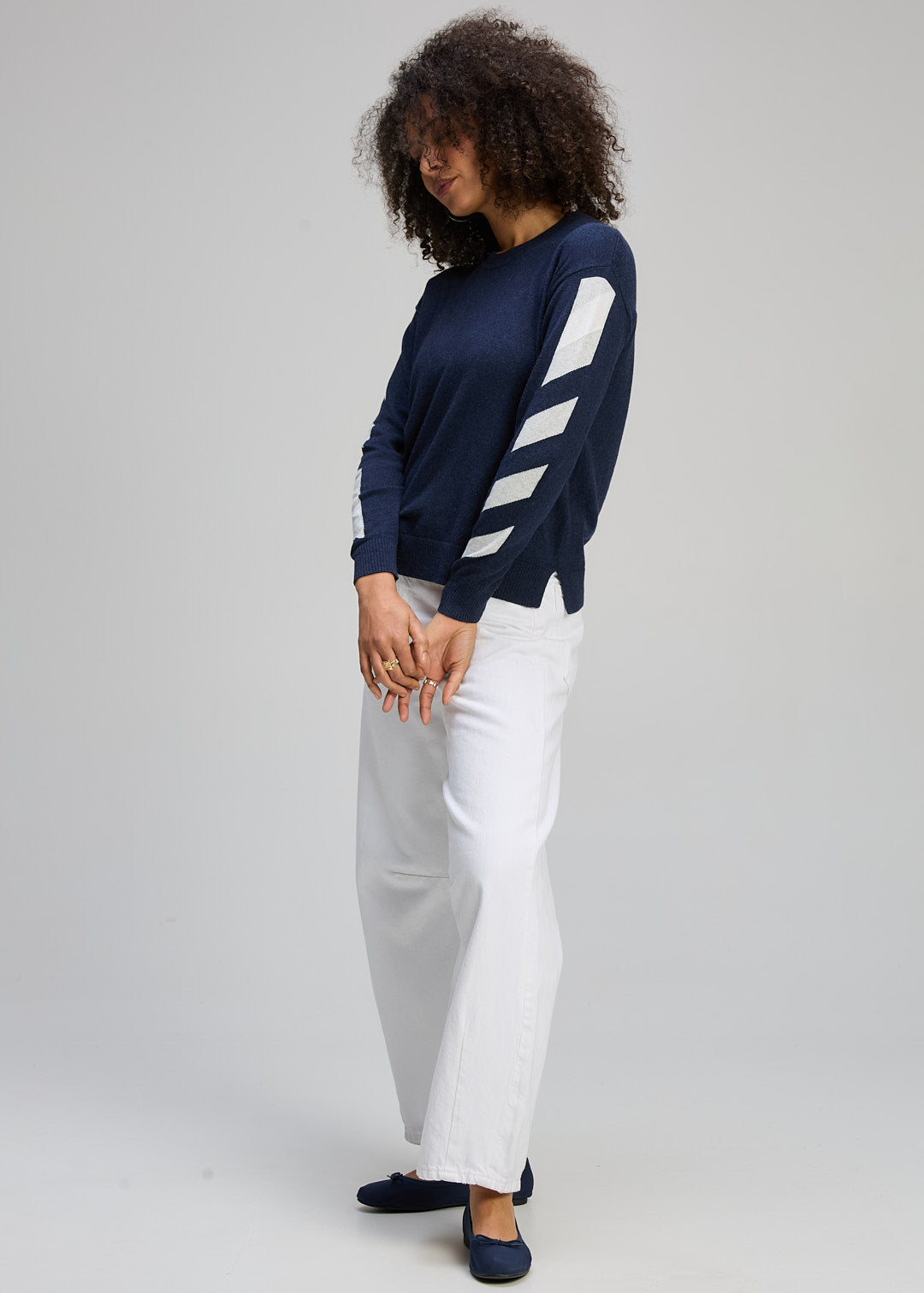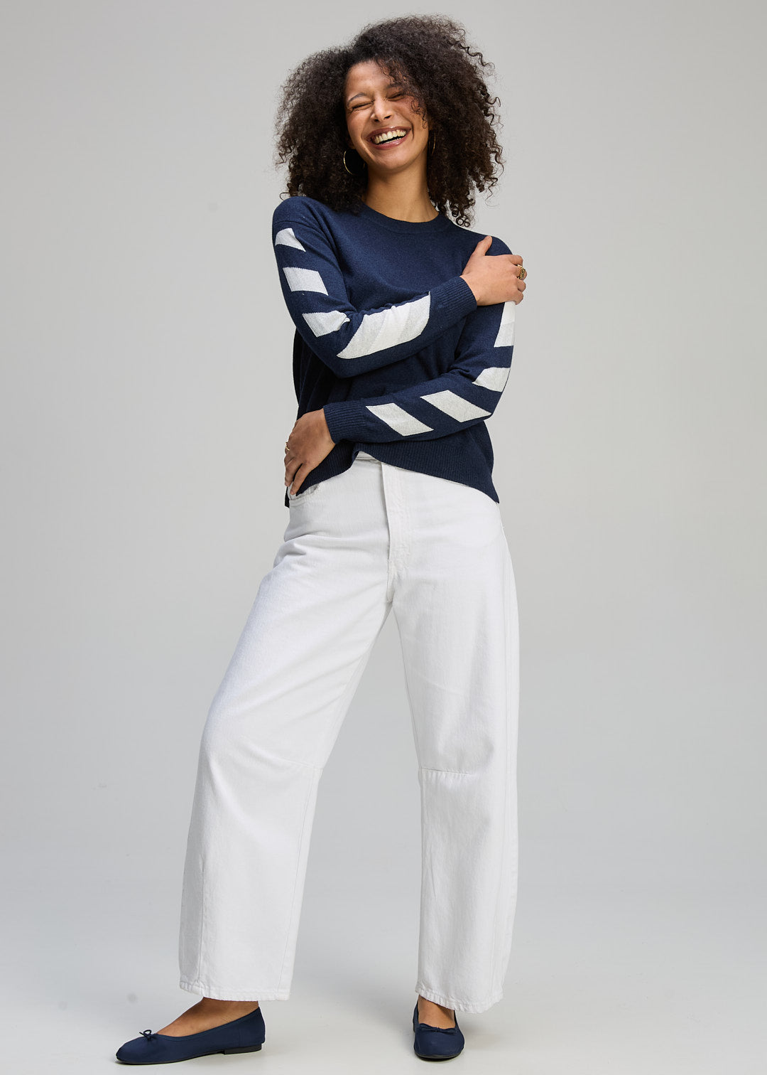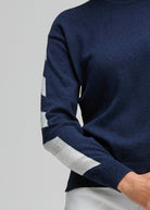 The Zaket & Plover Sleeve Accent Jumper in Dark Denim is the ultimate off-duty essential. This pullover elevates a timeless dark blue base with bold, geometric white chevron stripes along the sleeves, adding a fresh and modern edge to your knitwear rotation.